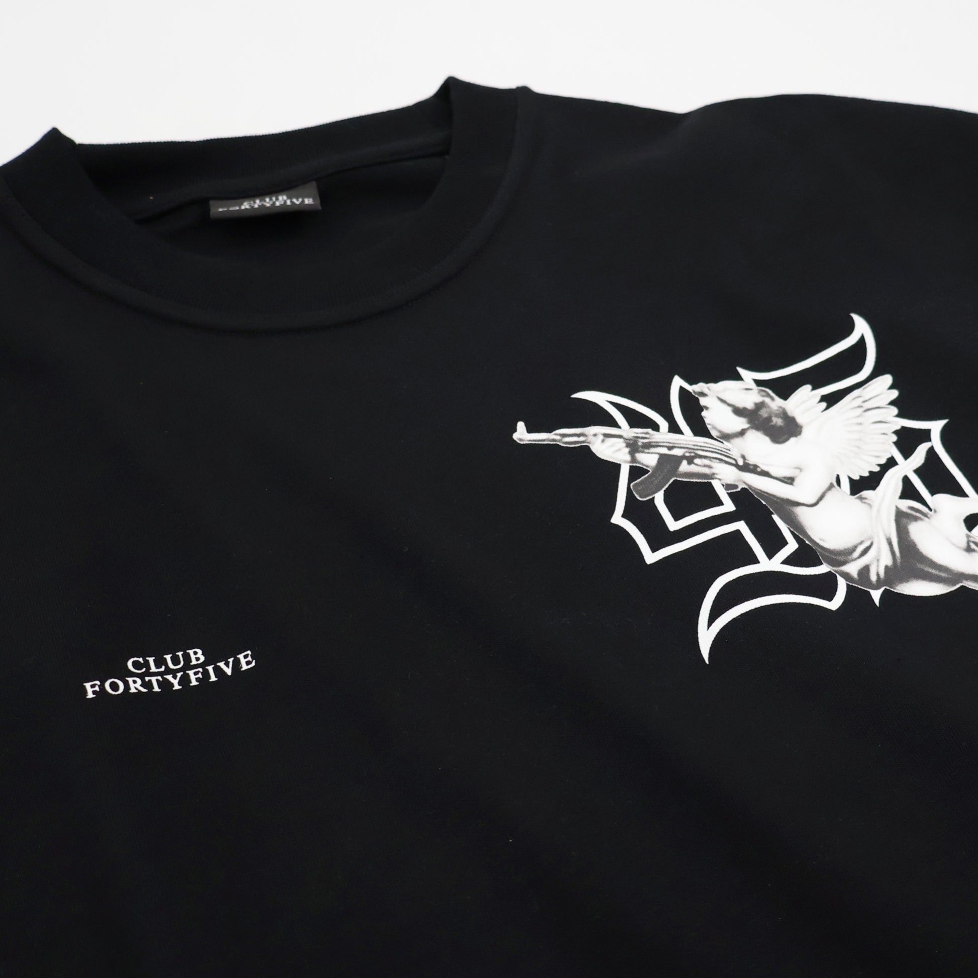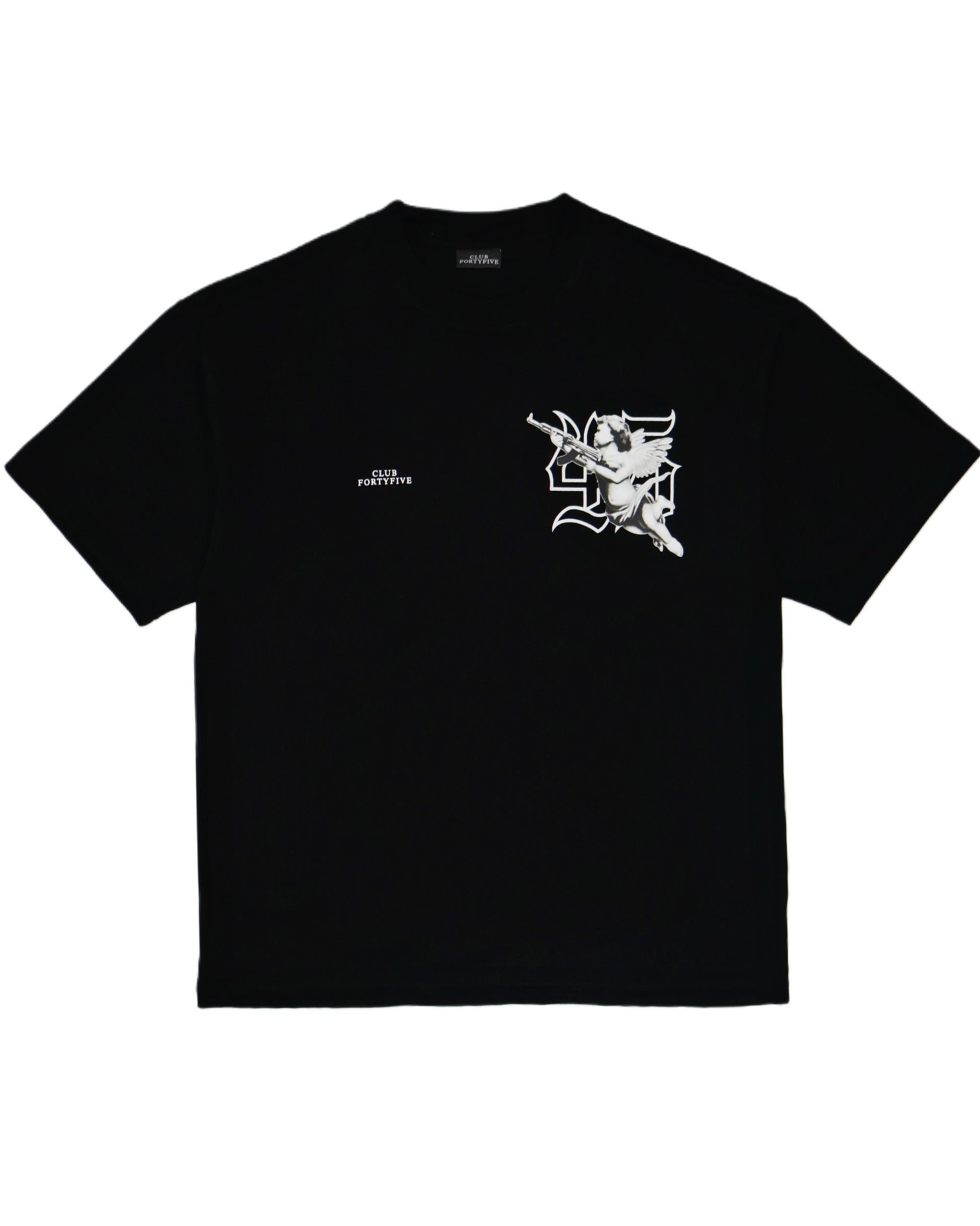 The fortyfive cherub print tee, made for luxury with a oversized fit in a medium weight cotton. With a ribbed crewneck collar and Club Fortyfive front logo print.