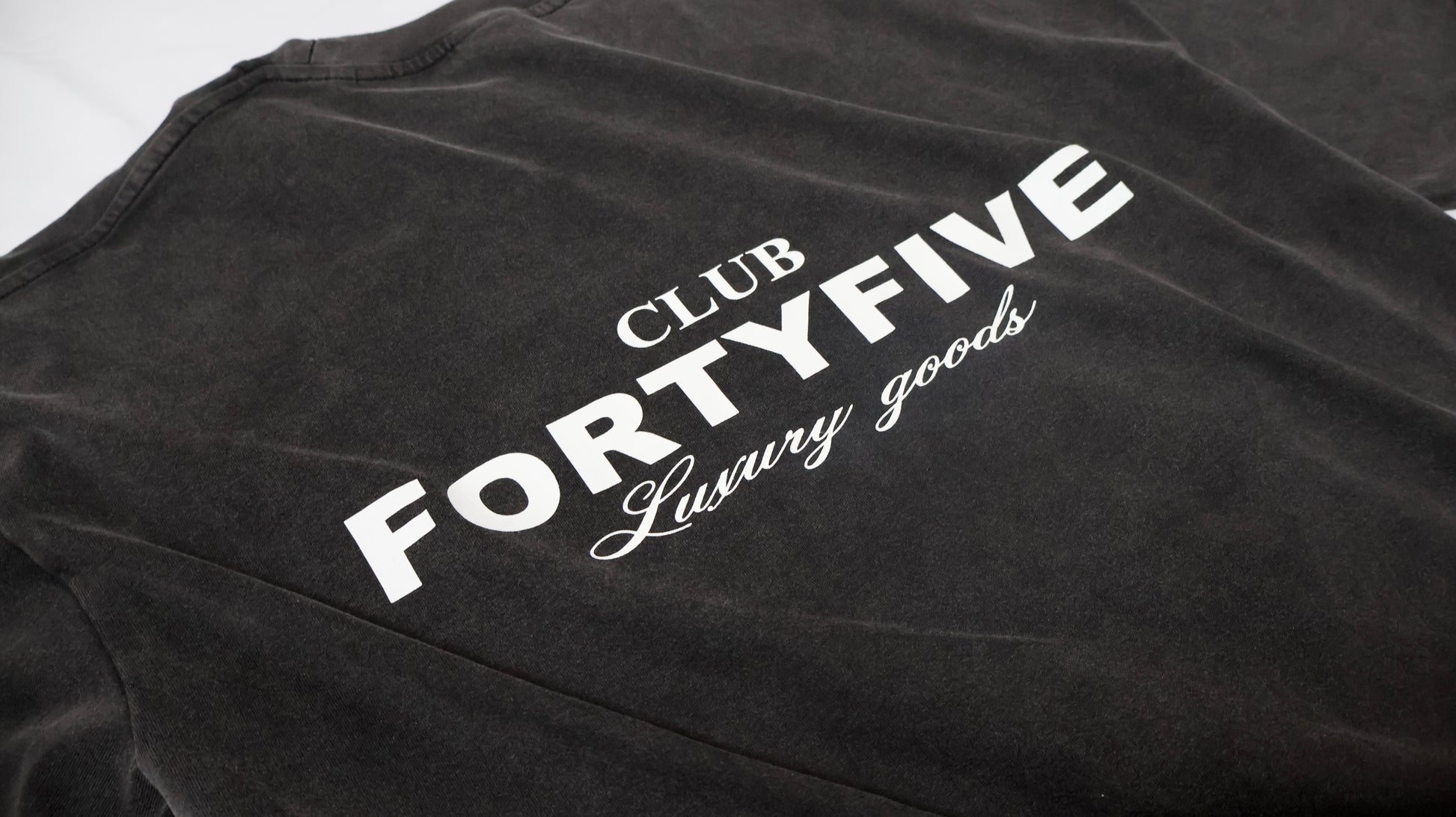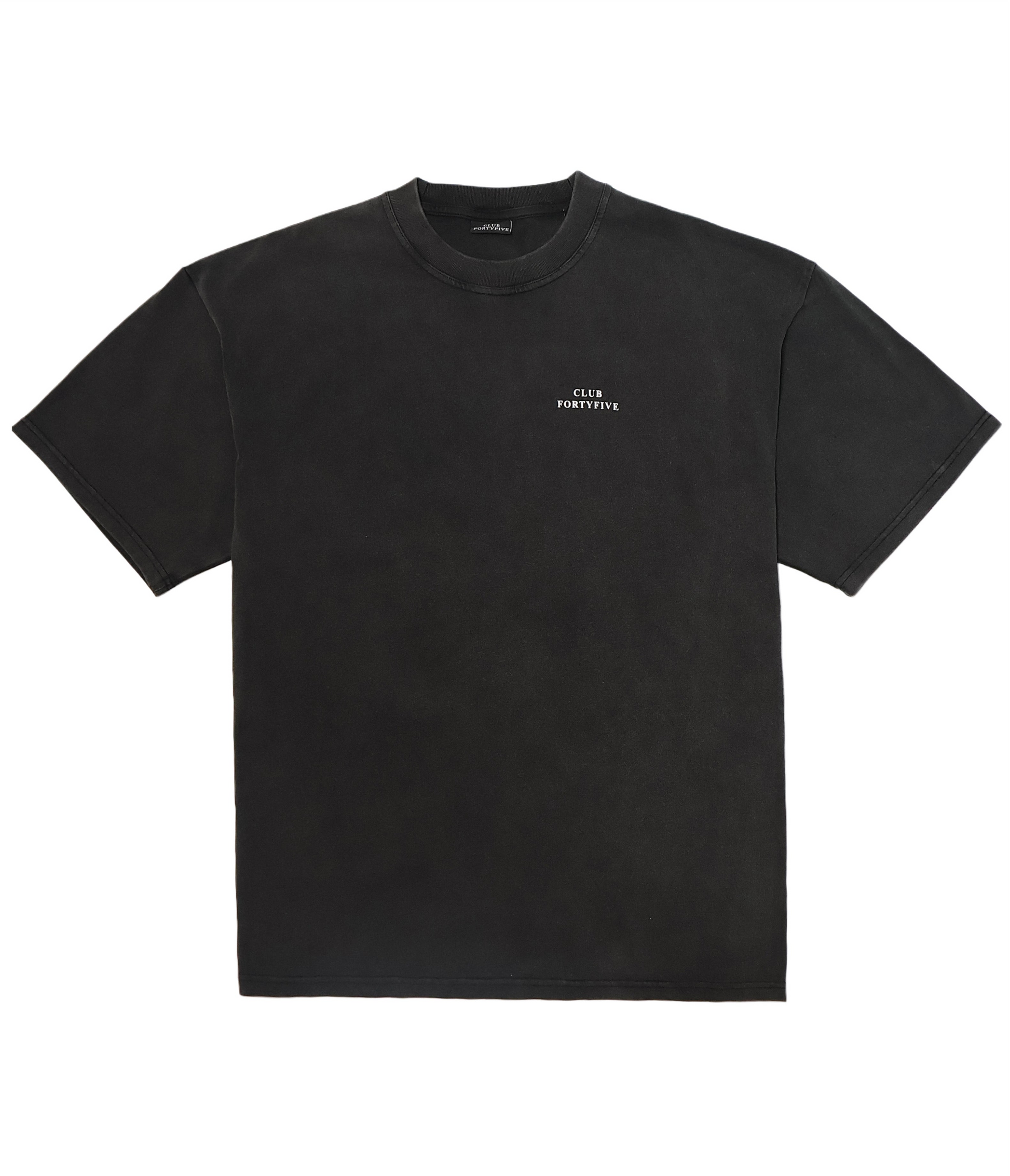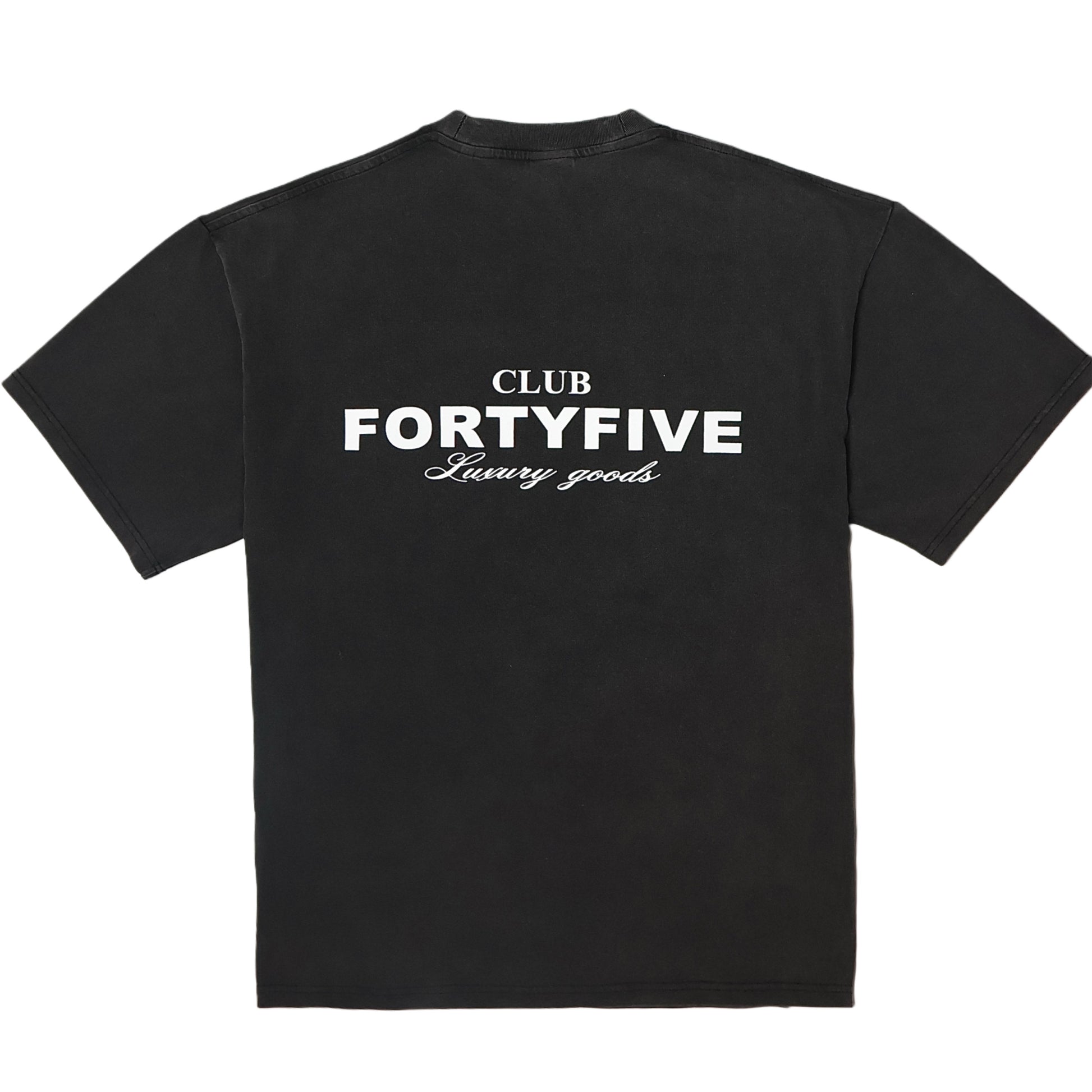 The Club Fortyfive signature tee, made for luxury with an oversized fit in a medium weight cotton. With a ribbed crewneck collar and Club Fortyfive front logo print. And signature print on the back.